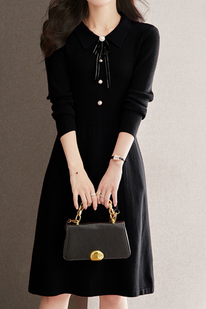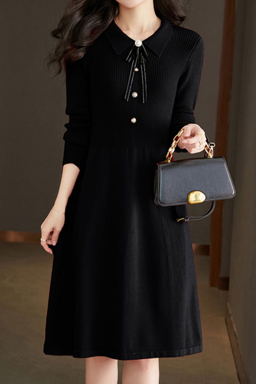 Elegant Temperament Shirt Collar Long-Sleeve Knitted Dress