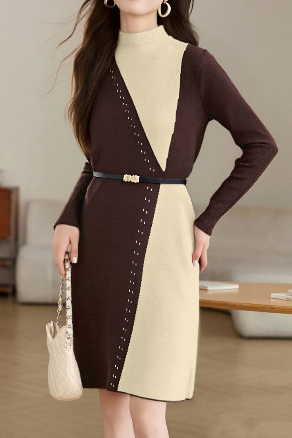 Minimalist Warm Half-High Neck Tie Knitted Dress - liwisi