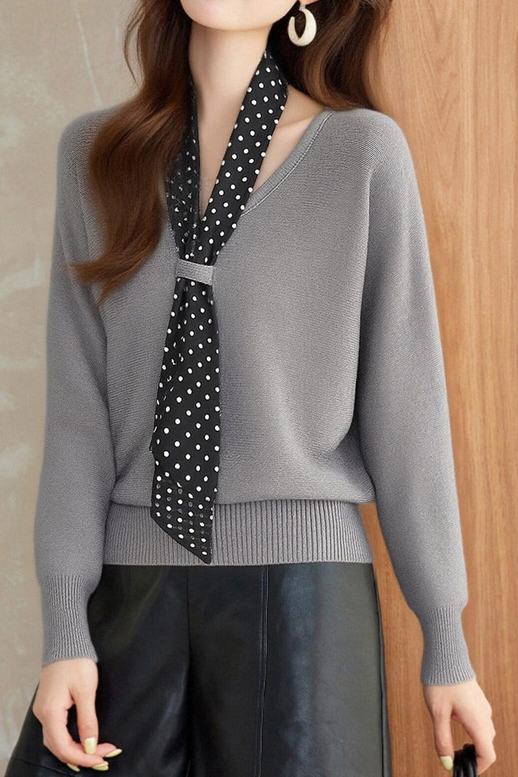 Casual Versatile V-Neck Polka Dot Scarf Necktie Batwing Sleeve Pullover Knitted Top