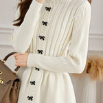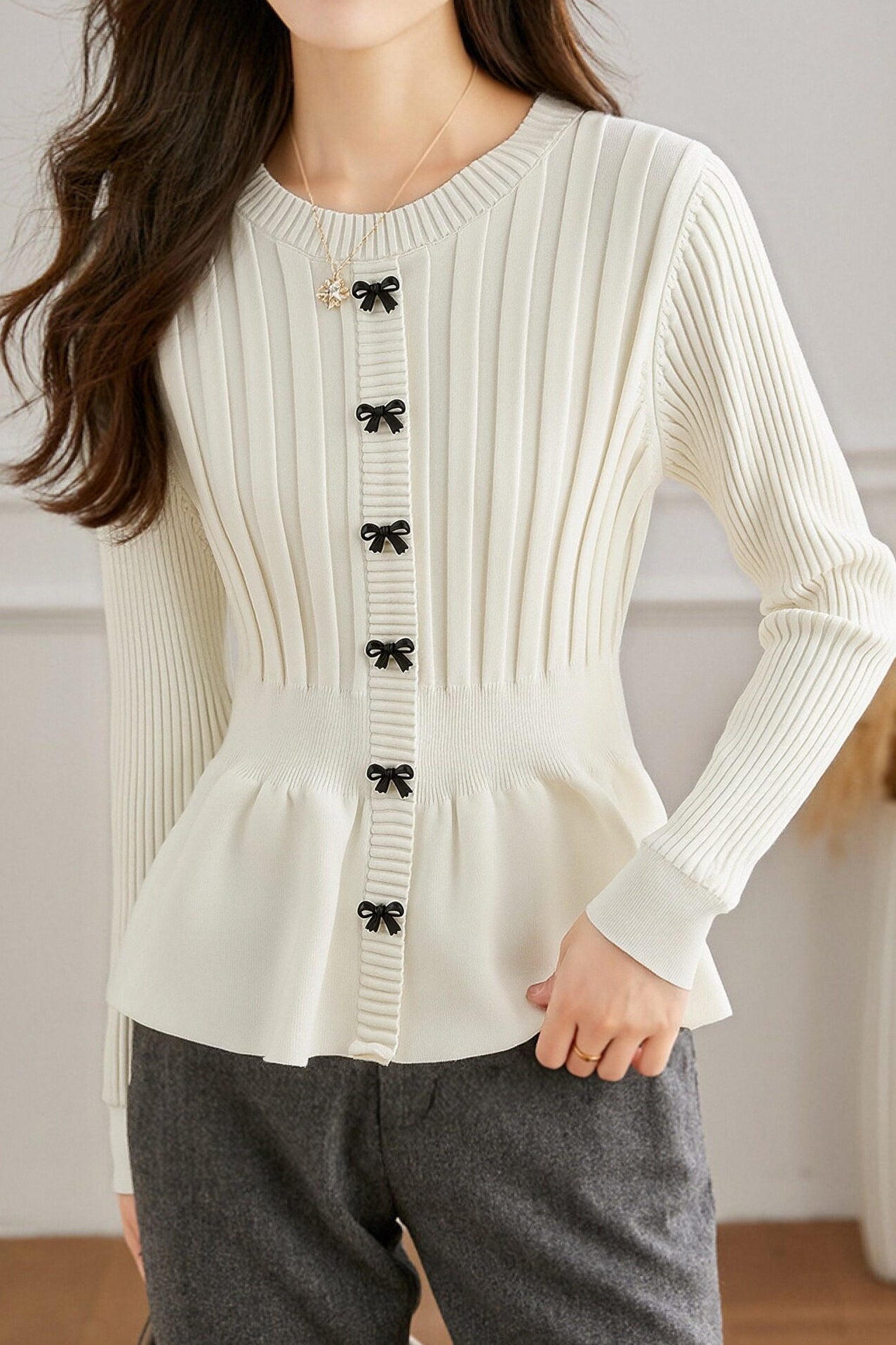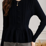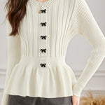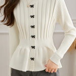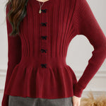 Pullover knitted top, crew neck long-sleeve waist-cinching fit, single row of bow decorative buttons at the front, waist cinching design, wavy hem, ribbed texture on both body and sleeves |