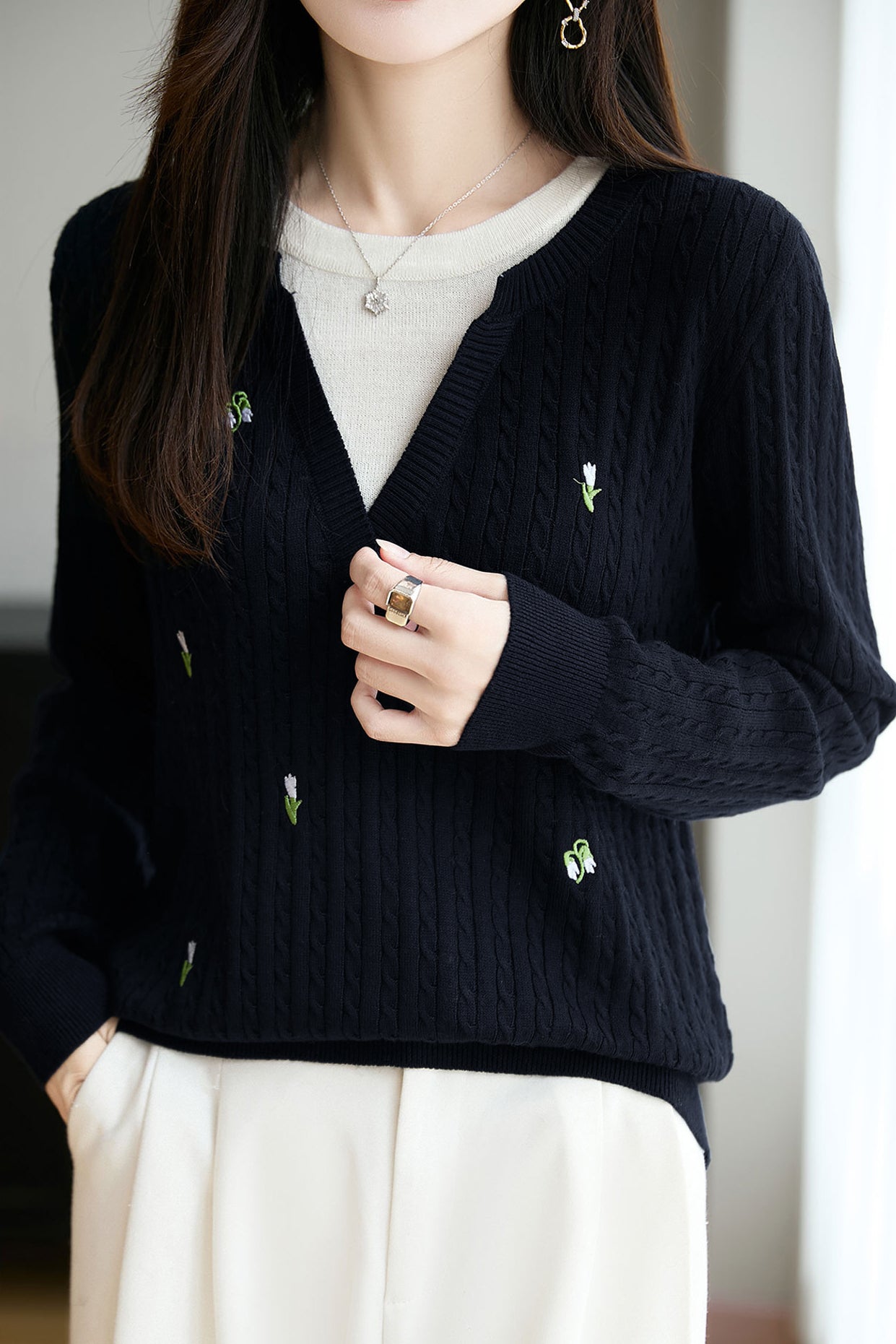 V-neck Simple Contrast Knit Top