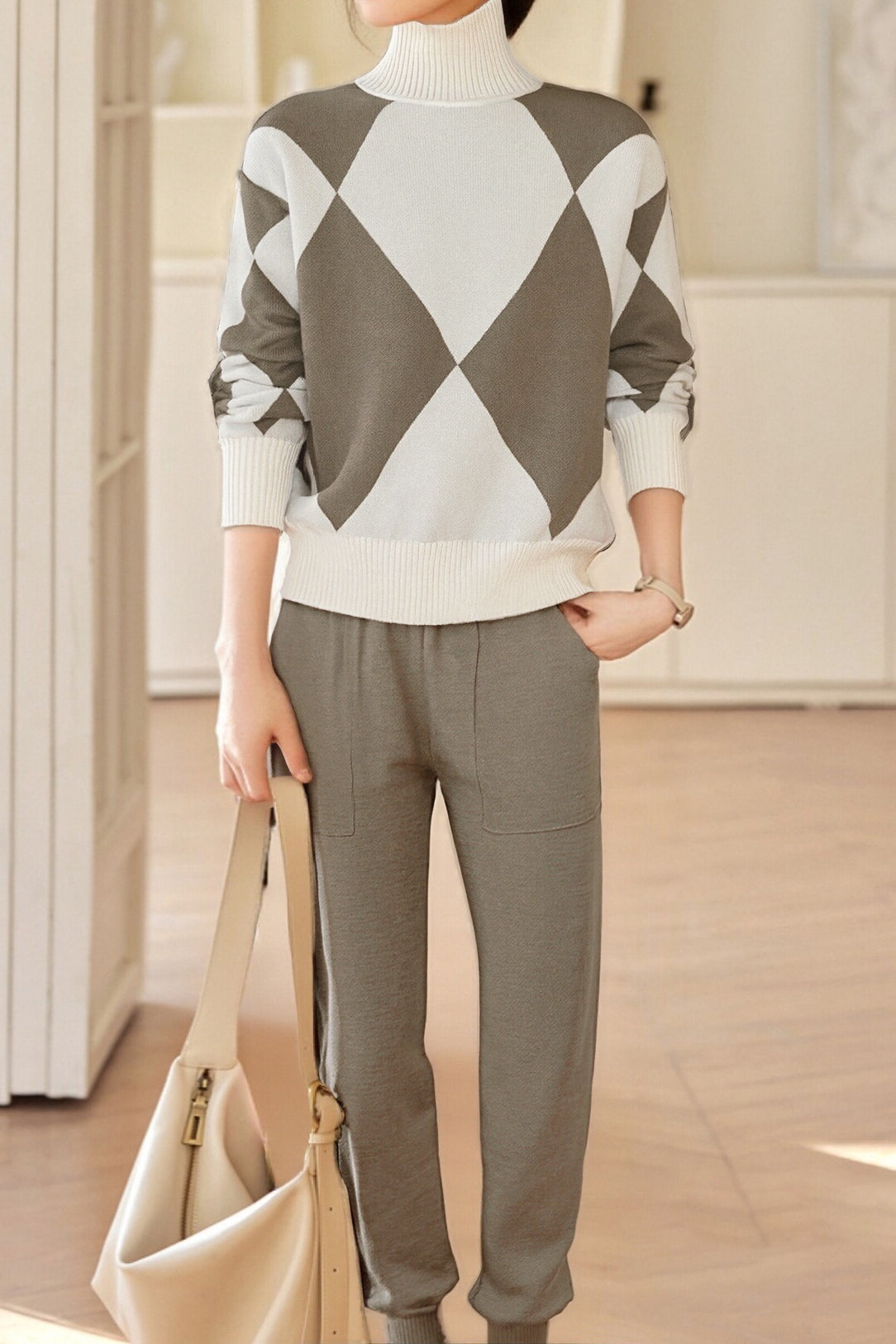 Skipper Collar Double Button Long Sleeve Top + Side Pocket Long Slacks + Back Slit Simple Long Skirt