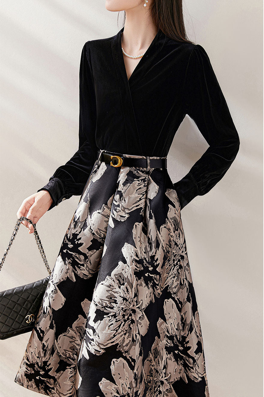 Elegant Velvet-Paneled Jacquard A-Line Dress