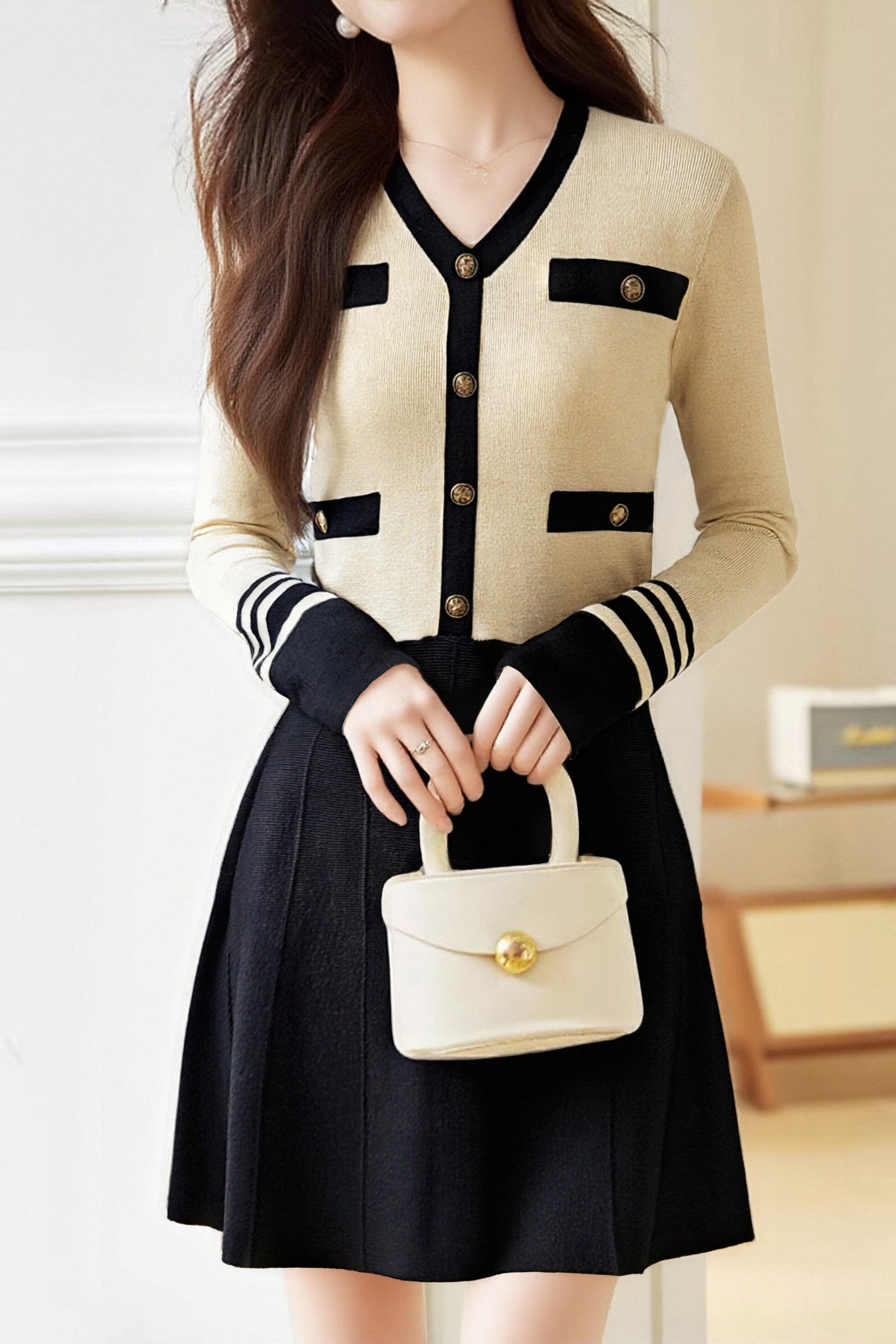 Mixed Material Heart Double Button Knit Dress - 3 Colors Available