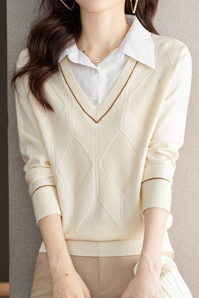 Casual Fake Two-Piece Shirt Collar Knitted Top