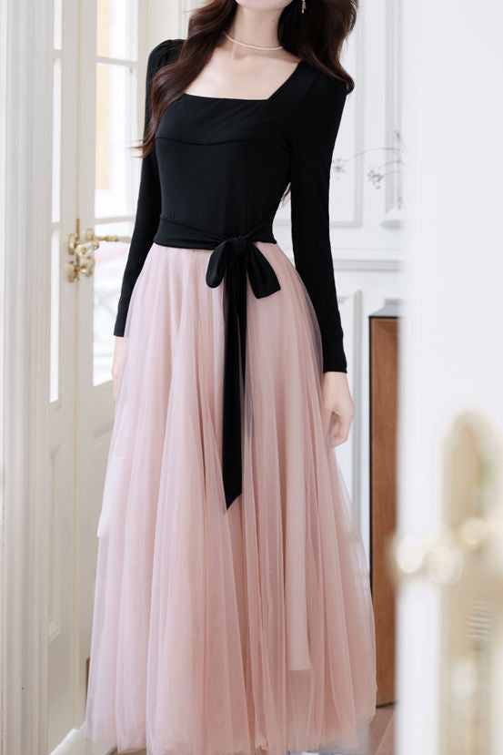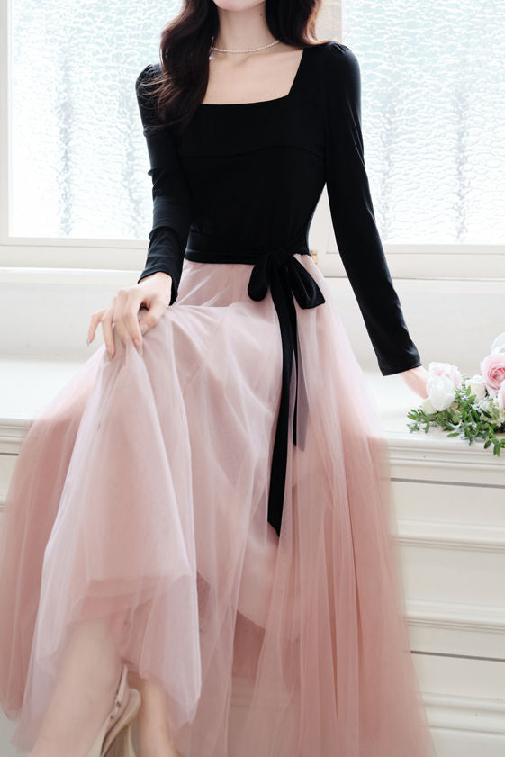Elegant Temperament Color-Block Patchwork Long-Sleeve Mesh Dress
