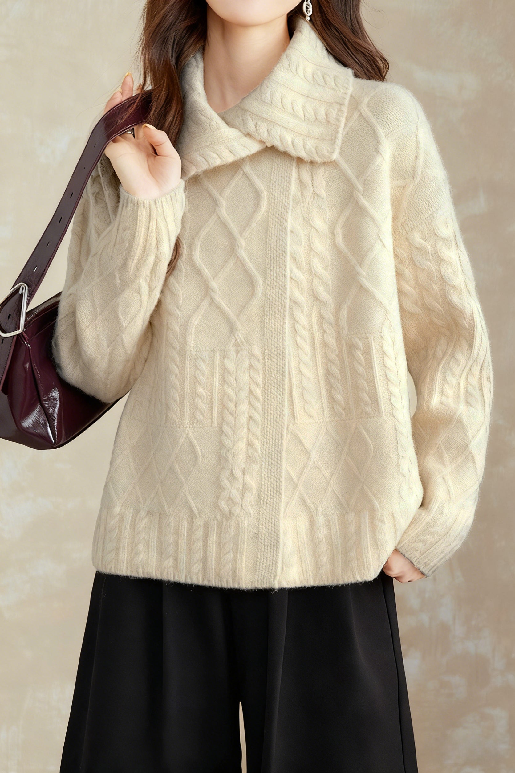 Casual Versatile Lapel Diagonal Placket Cable-Knit Cardigan