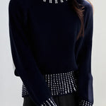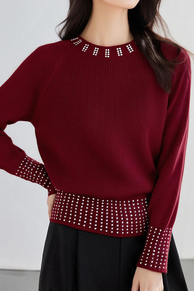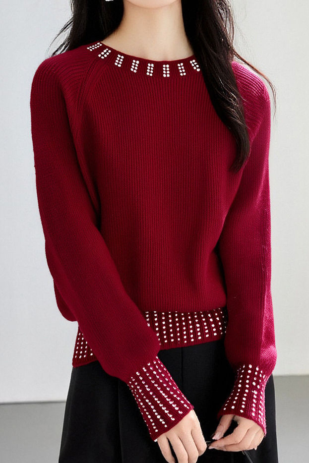 Knitted top, crew neck long-sleeve loose fit, neckline, hem and cuffs all decorated with rhinestones, full-body vertical ribbed texture, a minimalist basic style with exquisite embellishments |