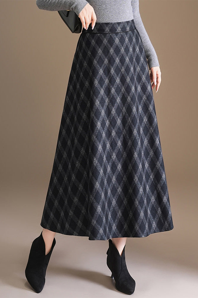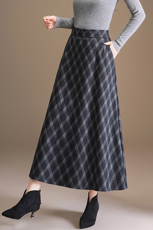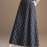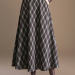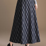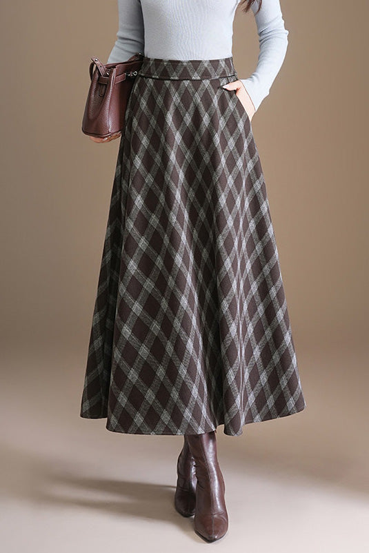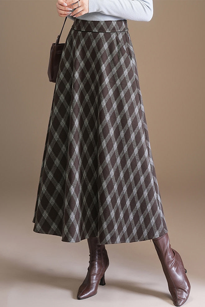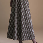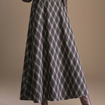 Midi skirt, long large swing fit, full-body with dark brown and light gray diamond plaid texture, elastic waistband at back, side slash pockets and one-side invisible zipper, hem drapes smoothly with loose silhouette, comes with a belt
