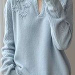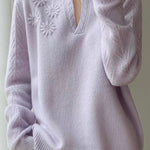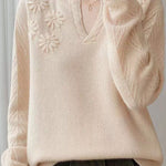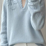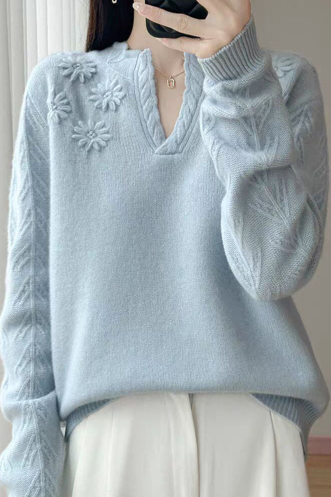 Knitted top, v-neck long-sleeve loose fit, small split design at neckline, three-dimensional floral jacquard decoration on one side of the chest, branch-shaped jacquard on sleeves, solid base color with partial texture details, cuffs and hem finished with ribbed trim