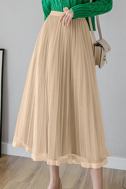 Casual Versatile Solid-Color Tulle Pleated Midi Skirt