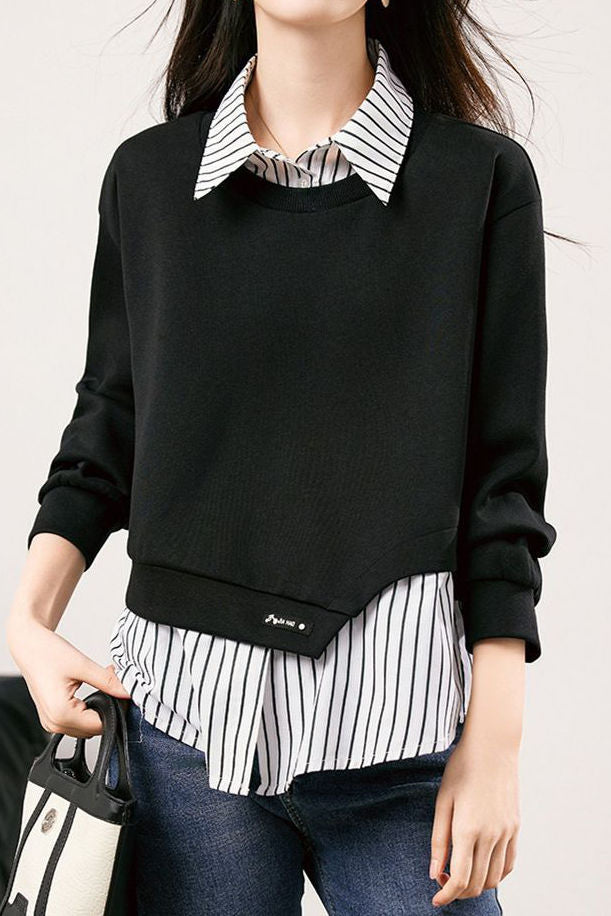 Casual Fake Two-Piece Striped Patchwork Shirt Collar Sweatshirt
