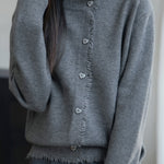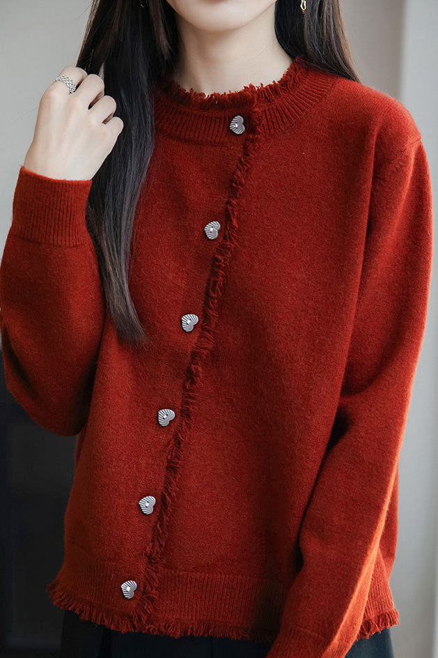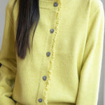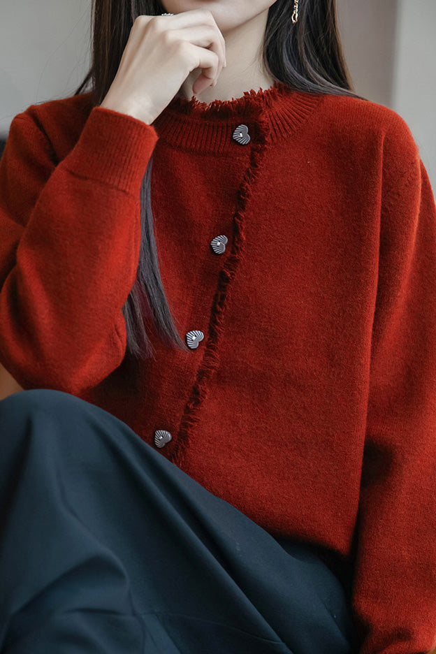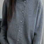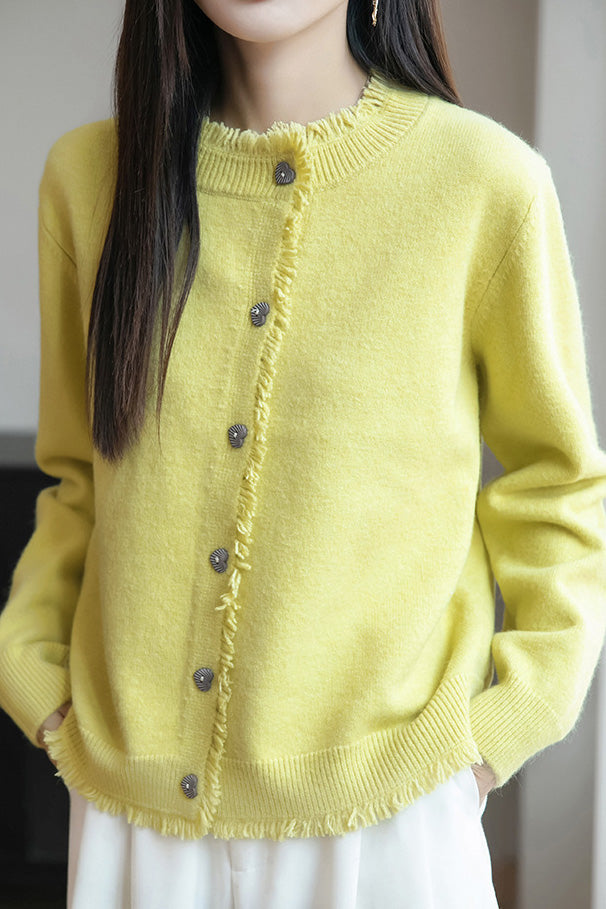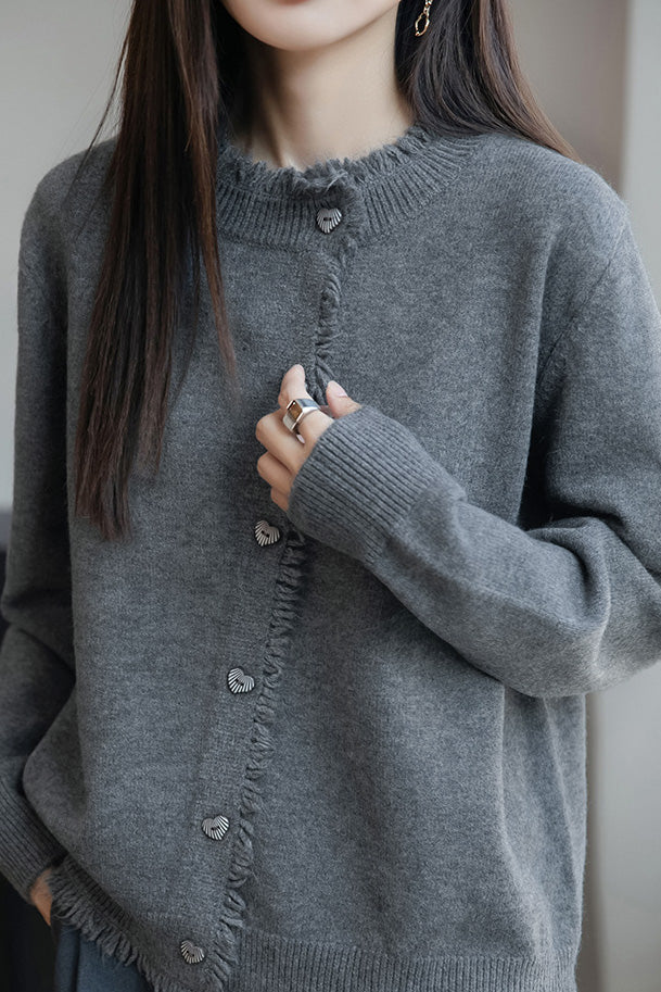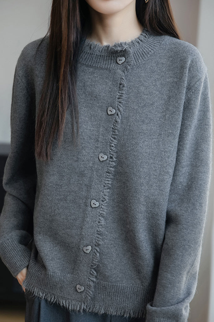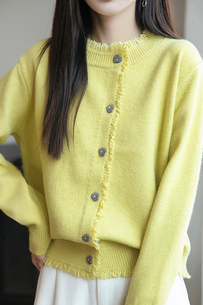 Cardigan with round neck and open front design, featuring frayed hem detailing for a relaxed look, made from soft, skin-friendly knit fabric