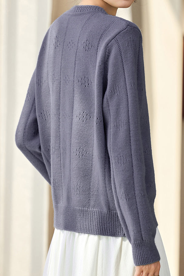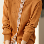 Knitted cardigan, crew neck long-sleeve loose fit, front placket with openable buttons, placket decorated with lace trim, body with hollow-out patterns |