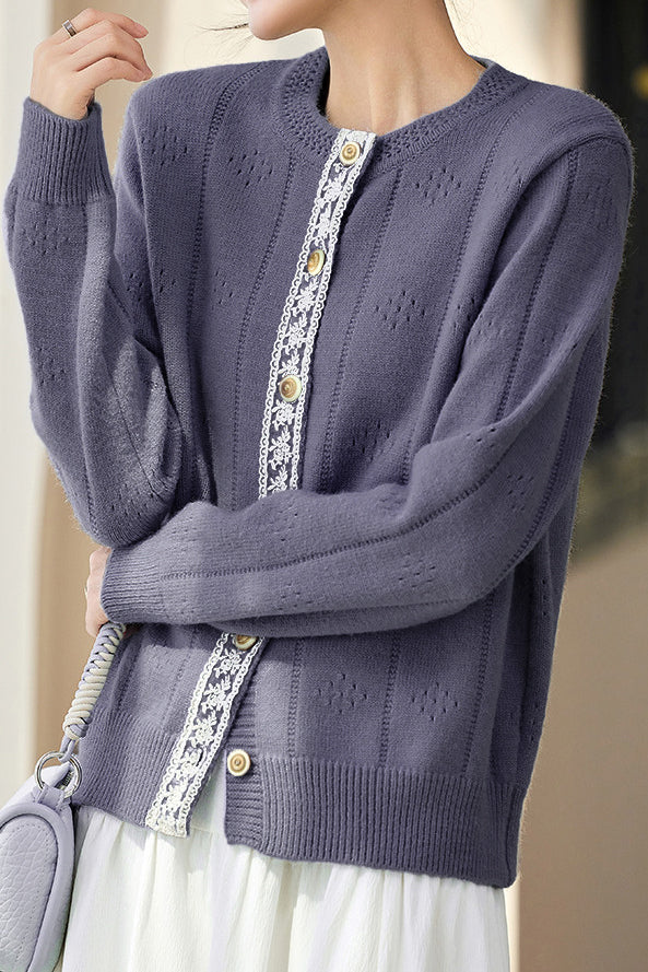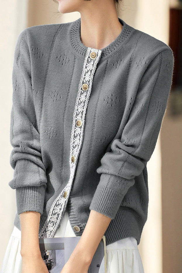 Casual Minimalist Crew Neck Lace Placket Knitted Cardigan