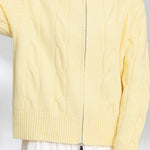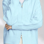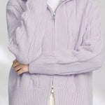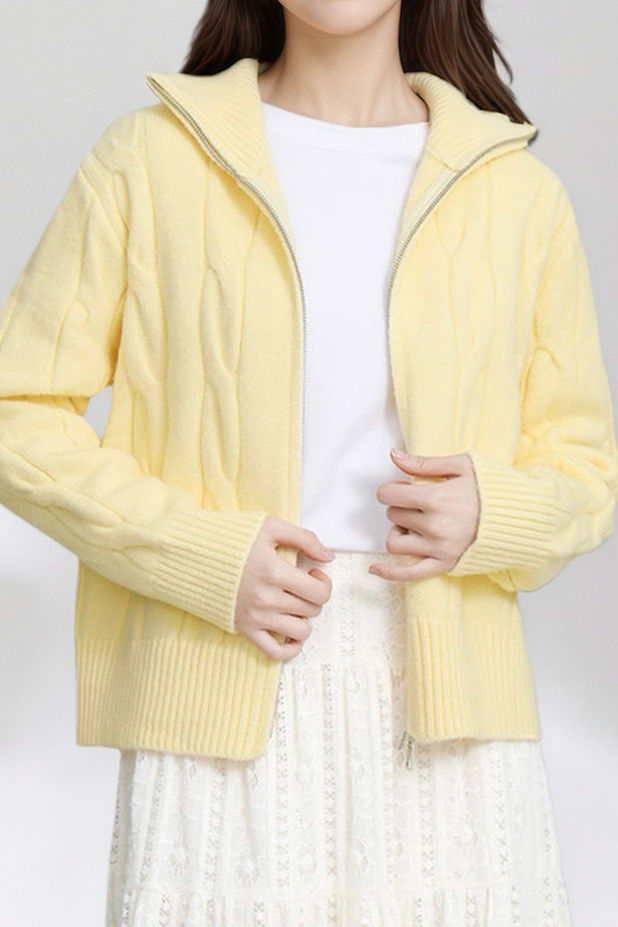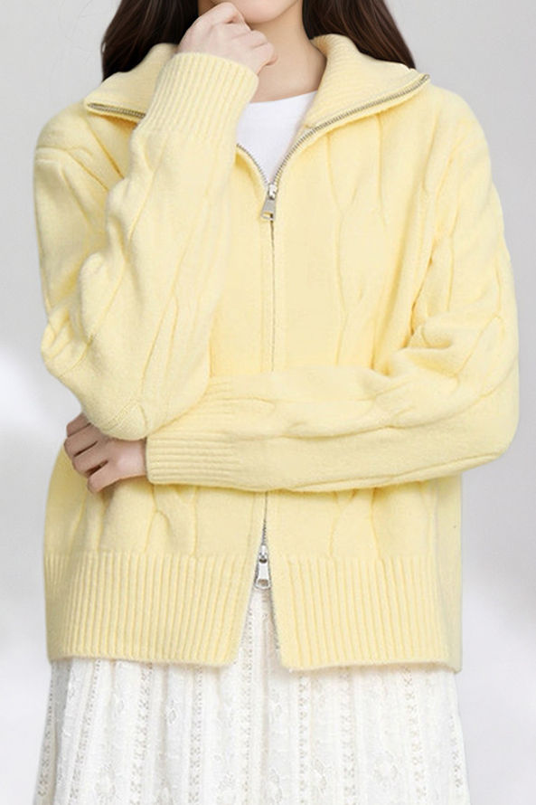 Cardigan, turtleneck long-sleeve loose fit, front center with openable double zippers, full-body solid-color cable-knit ribbed design