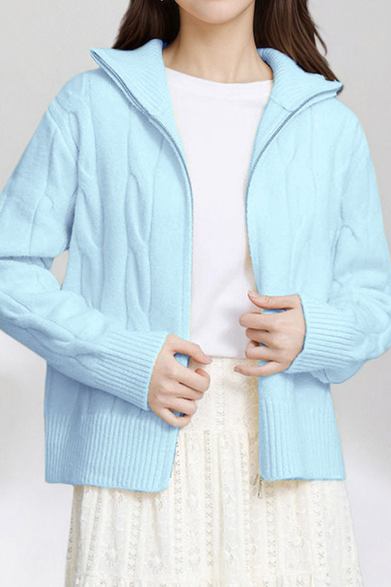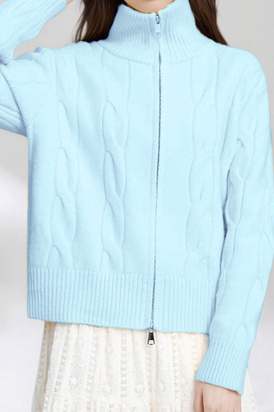 Casual Versatile Solid-Color Turtleneck Double-Zipper Cable-Knit Ribbed Cardigan