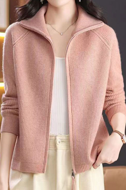 Knitted cardigan, convertible collar raglan long-sleeve loose fit, front center with openable double zippers, full-body solid-color fine ribbed knitted design |