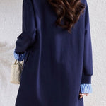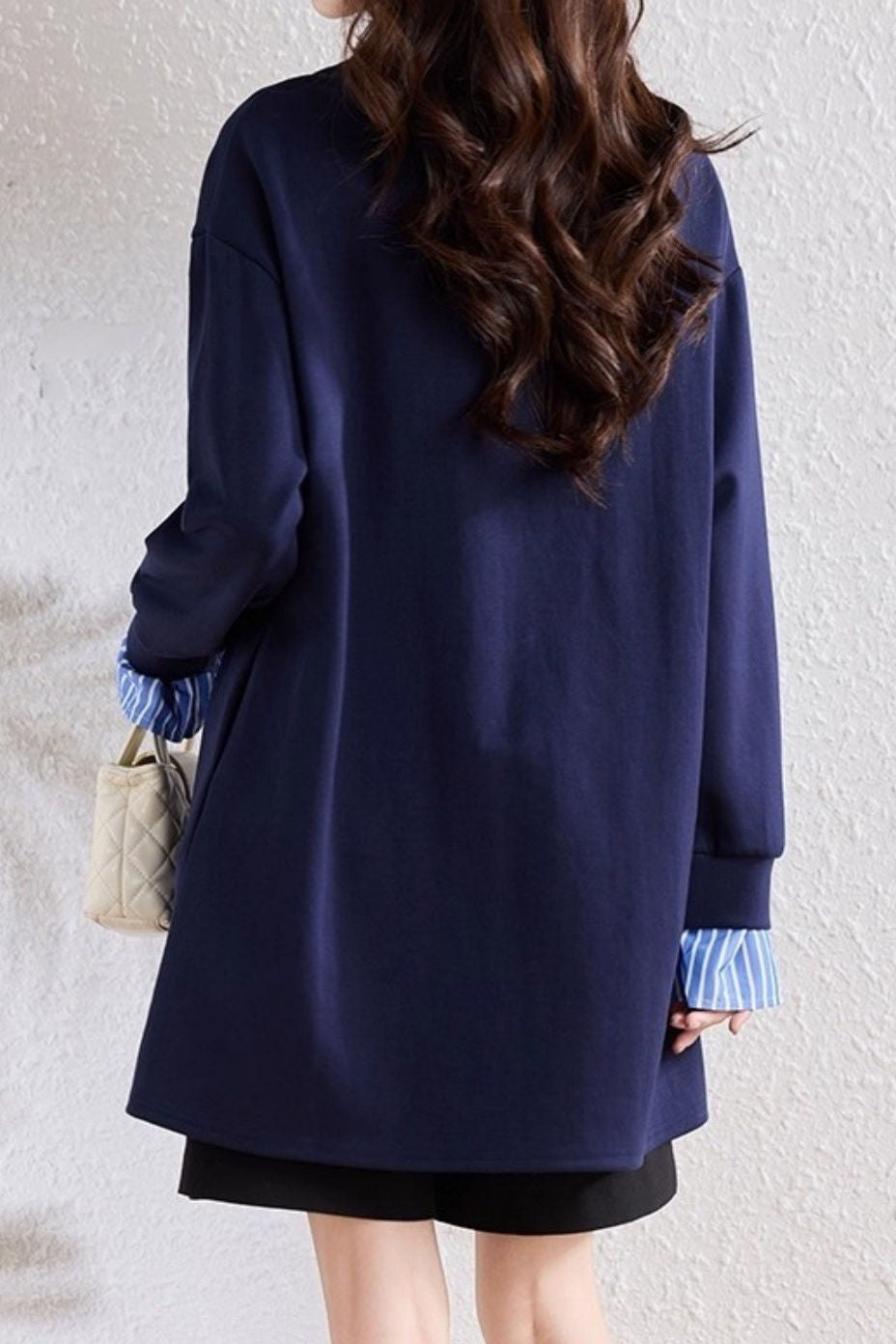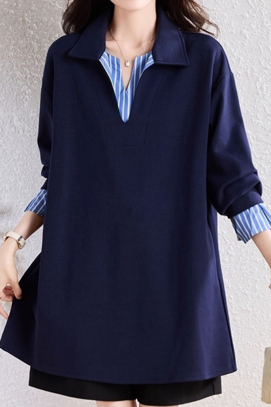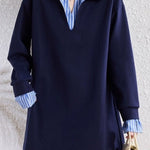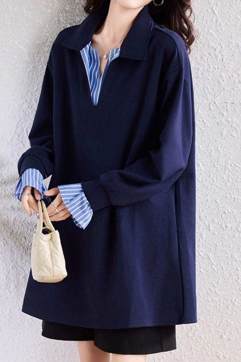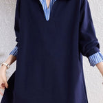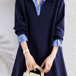 Dress, lapel long-sleeve loose mid-short fit, neckline spliced with striped fabric to form a half-placket fake v-neck and fake two-piece design, cuffs also spliced with striped decorative fabric |