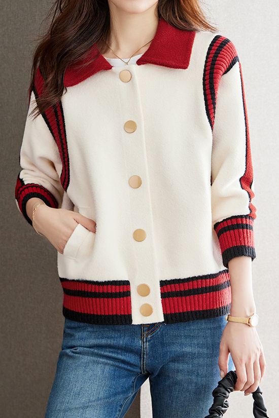 Casual Versatile Color-Block Striped Lapel Knitted Coat