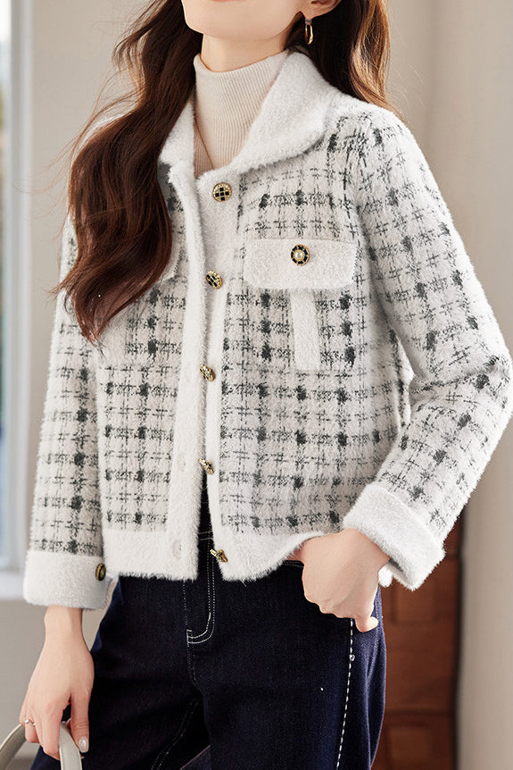 Casual Color-Block Plaid Lapel Cable-Knit Cardigan