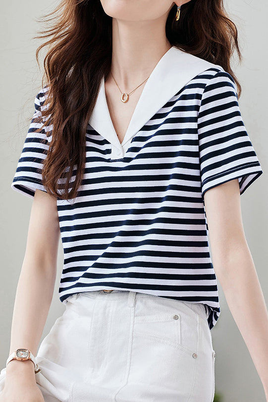 T-shirt, lapel short sleeve loose fit, horizontal stripe pattern all over, large lapel patchwork at neck, half-placket button decoration at front. |