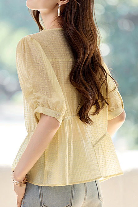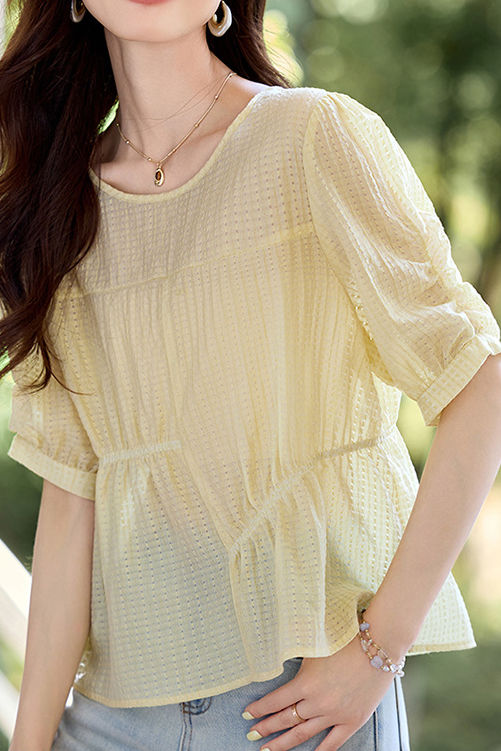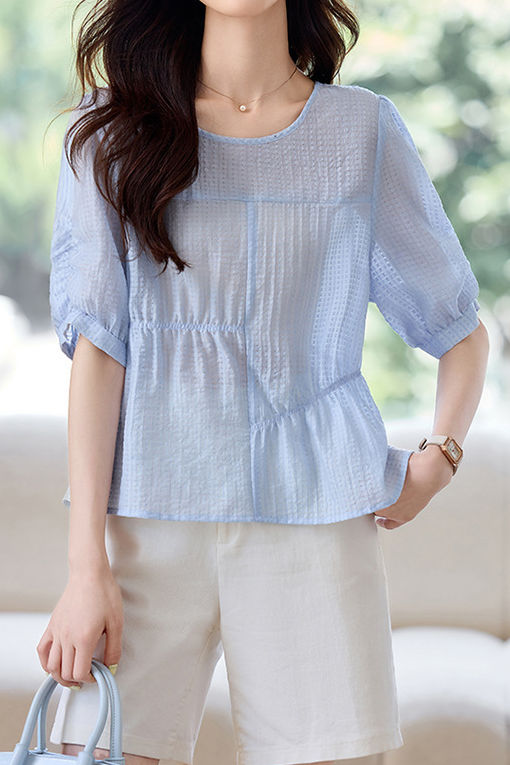 T-shirt with puff sleeves and loose silhouette, textured fabric for refined details, curved hem for a light feel, creating a fresh and relaxed daily look. |