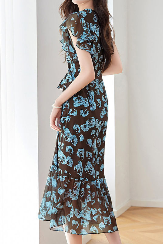 Dress,V-neck ruffle sleeve design gentle and elegant,rose print lively and romantic,tie waist accents figure,chiffon hem flowing and smooth |