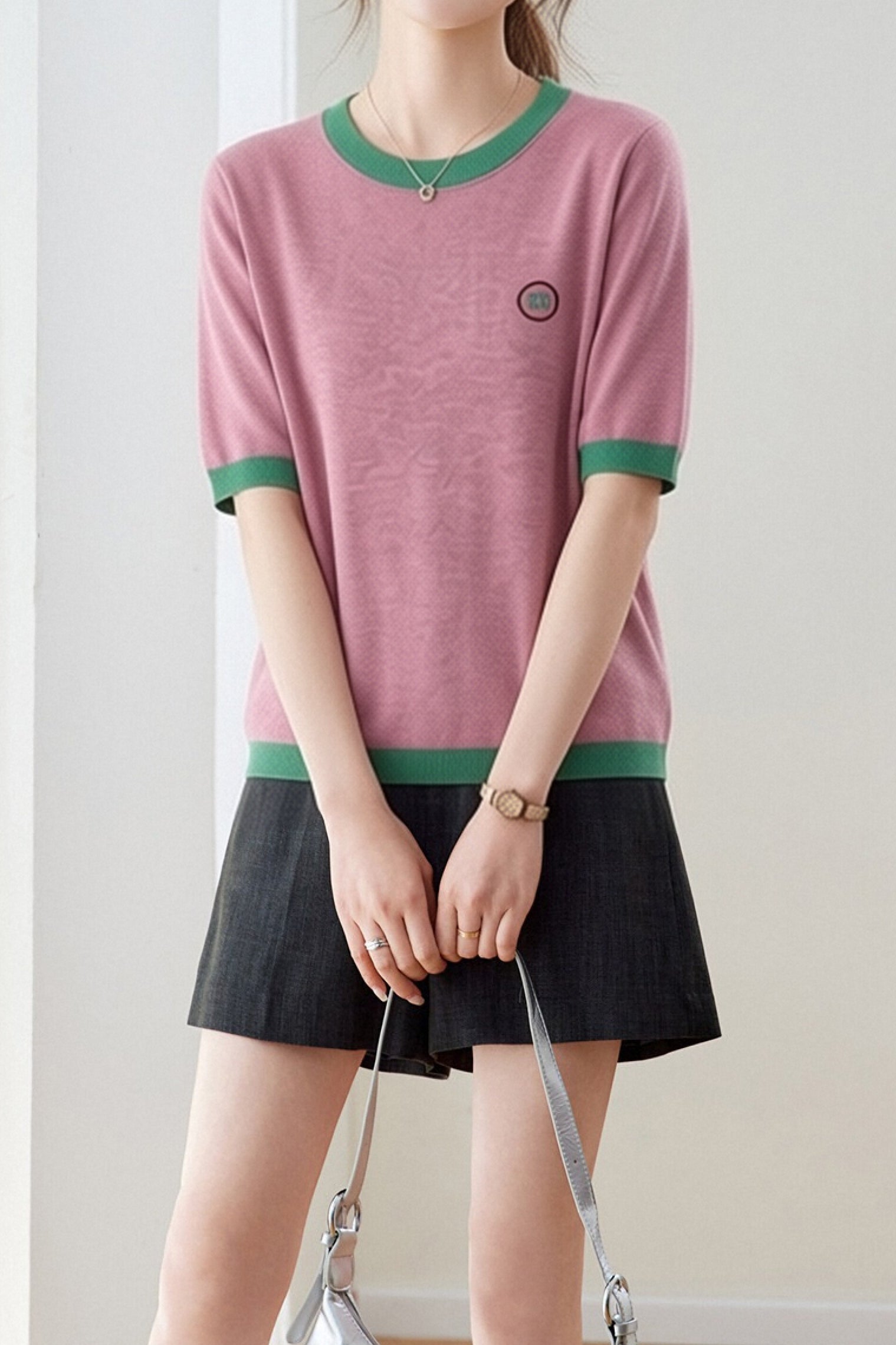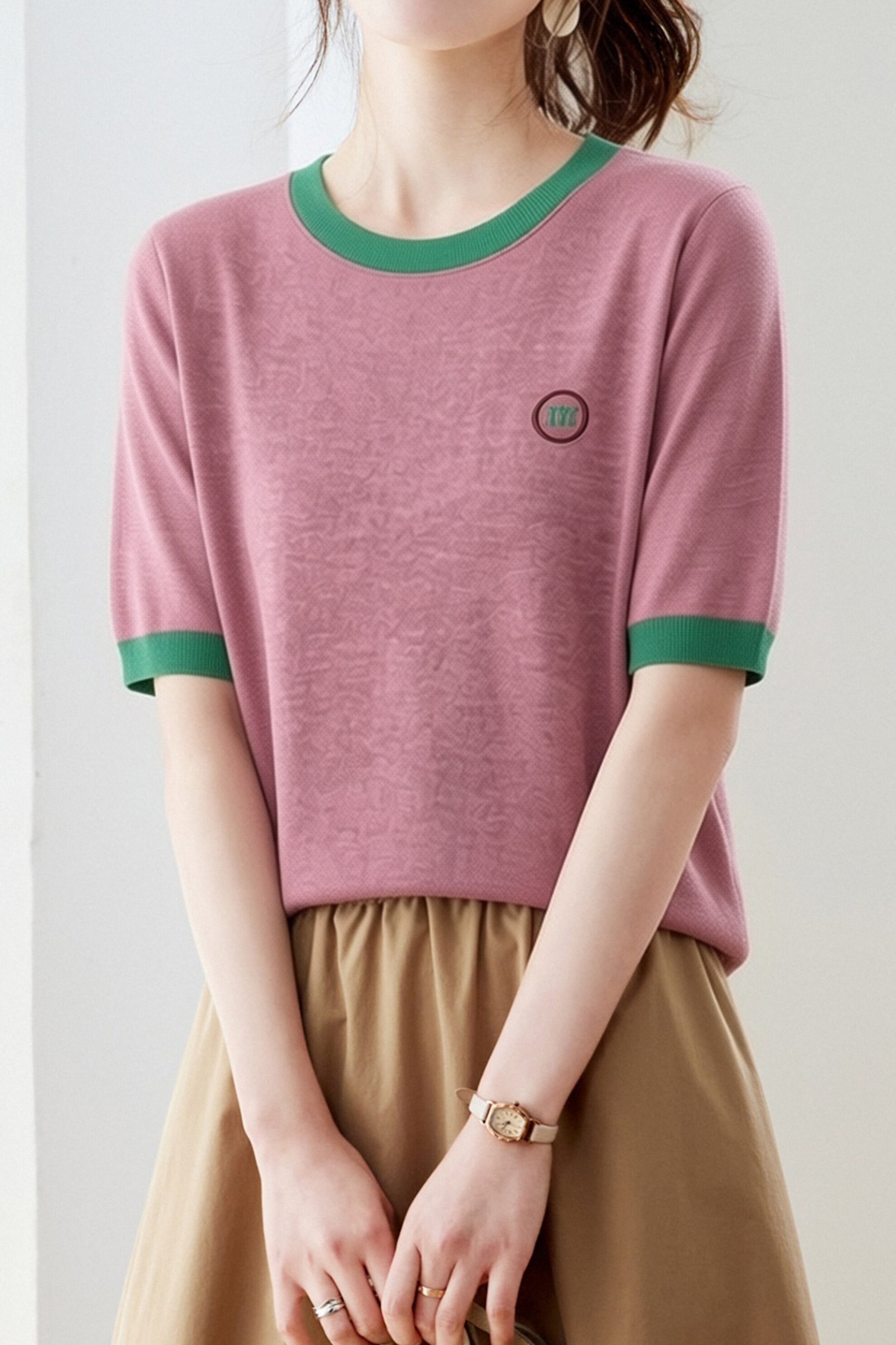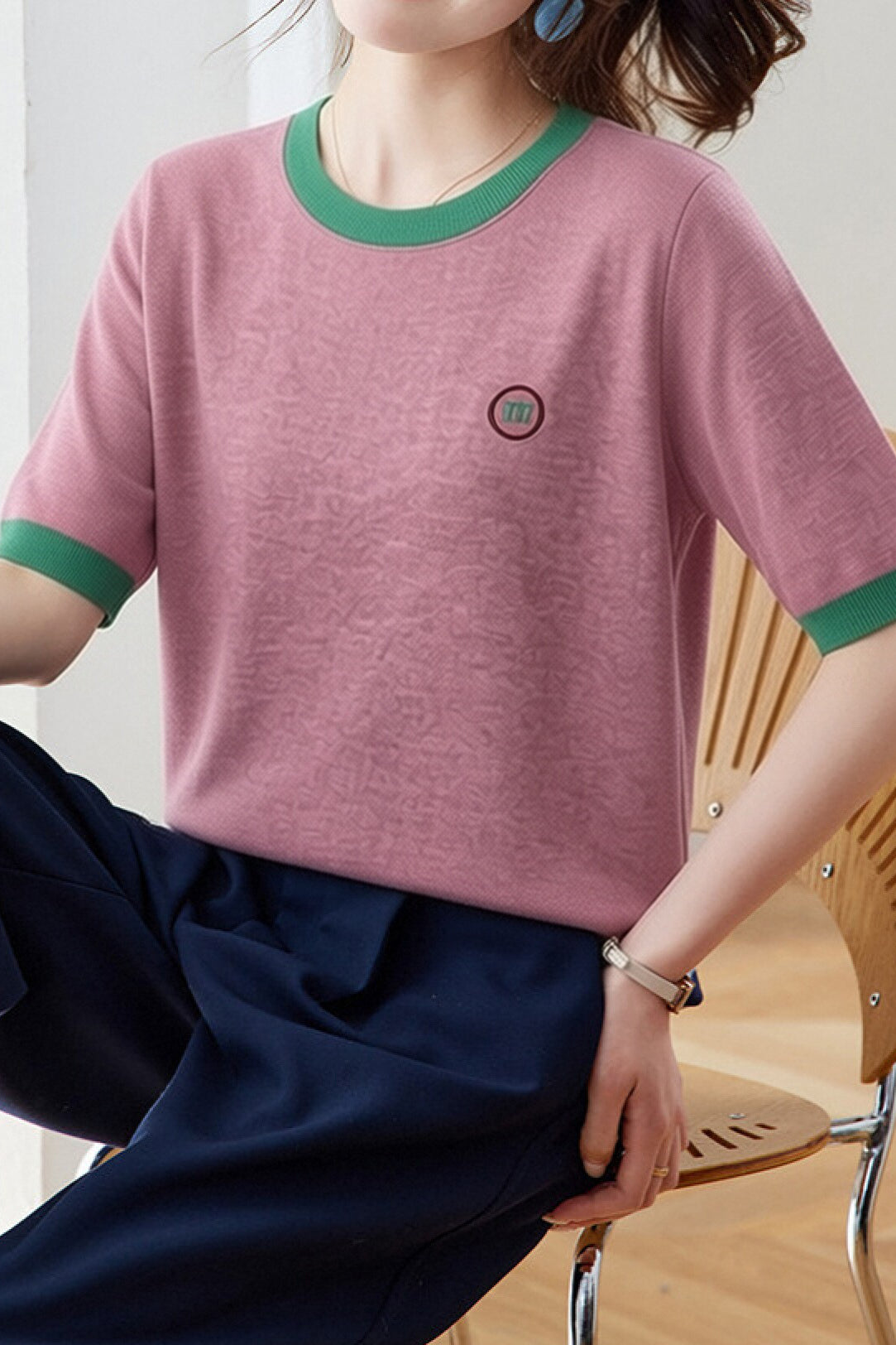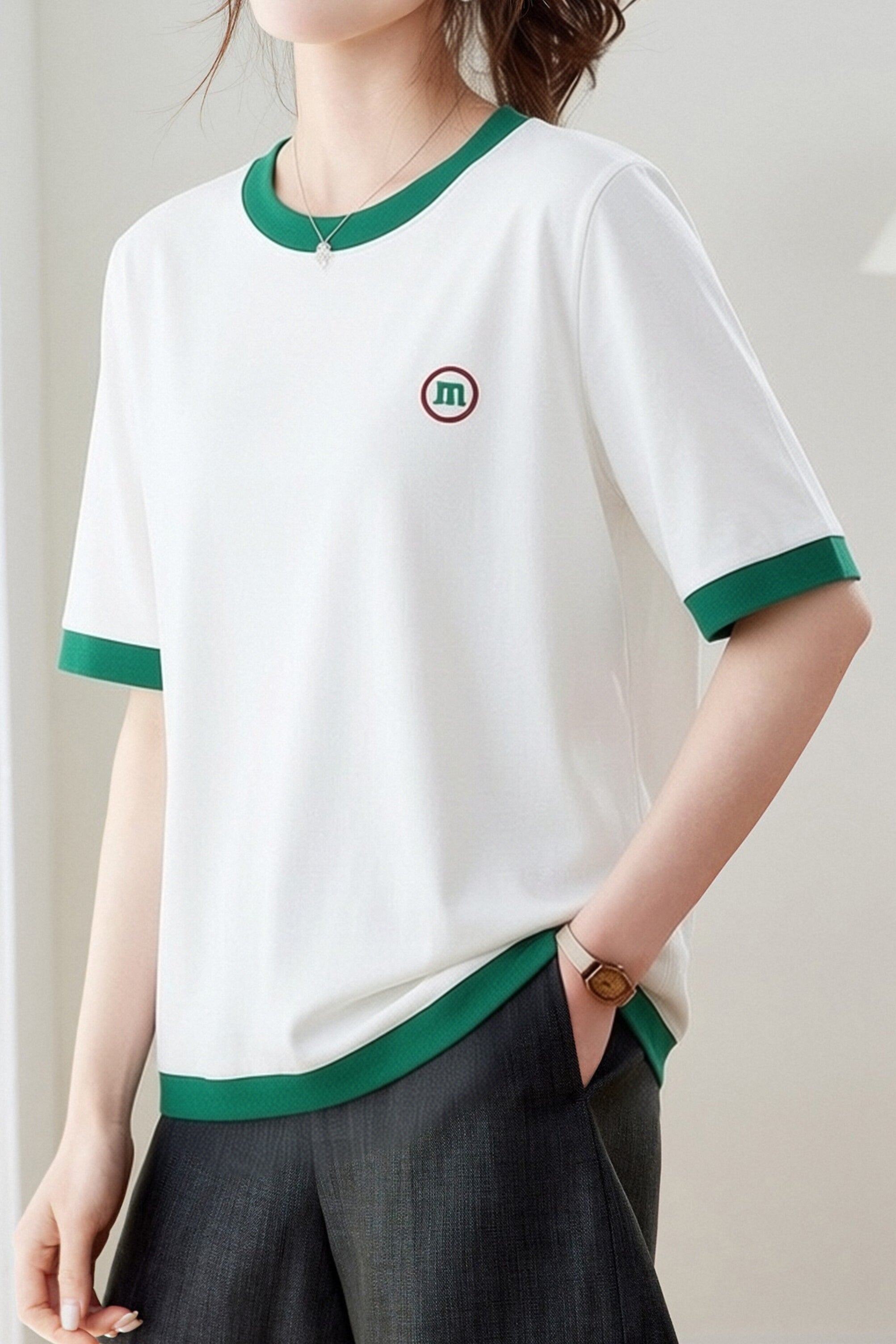 T-shirt,crew neck color block adds details,loose fit releases relaxation,small label decoration adds exquisite highlight,showing casual leisure style overall |
