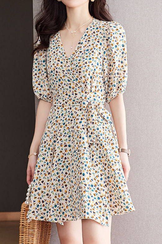 Dress,V-neck puff sleeve design,waist tie gently cinches waistline,small floral print creates relaxed French atmosphere,showing relaxation and delicacy |