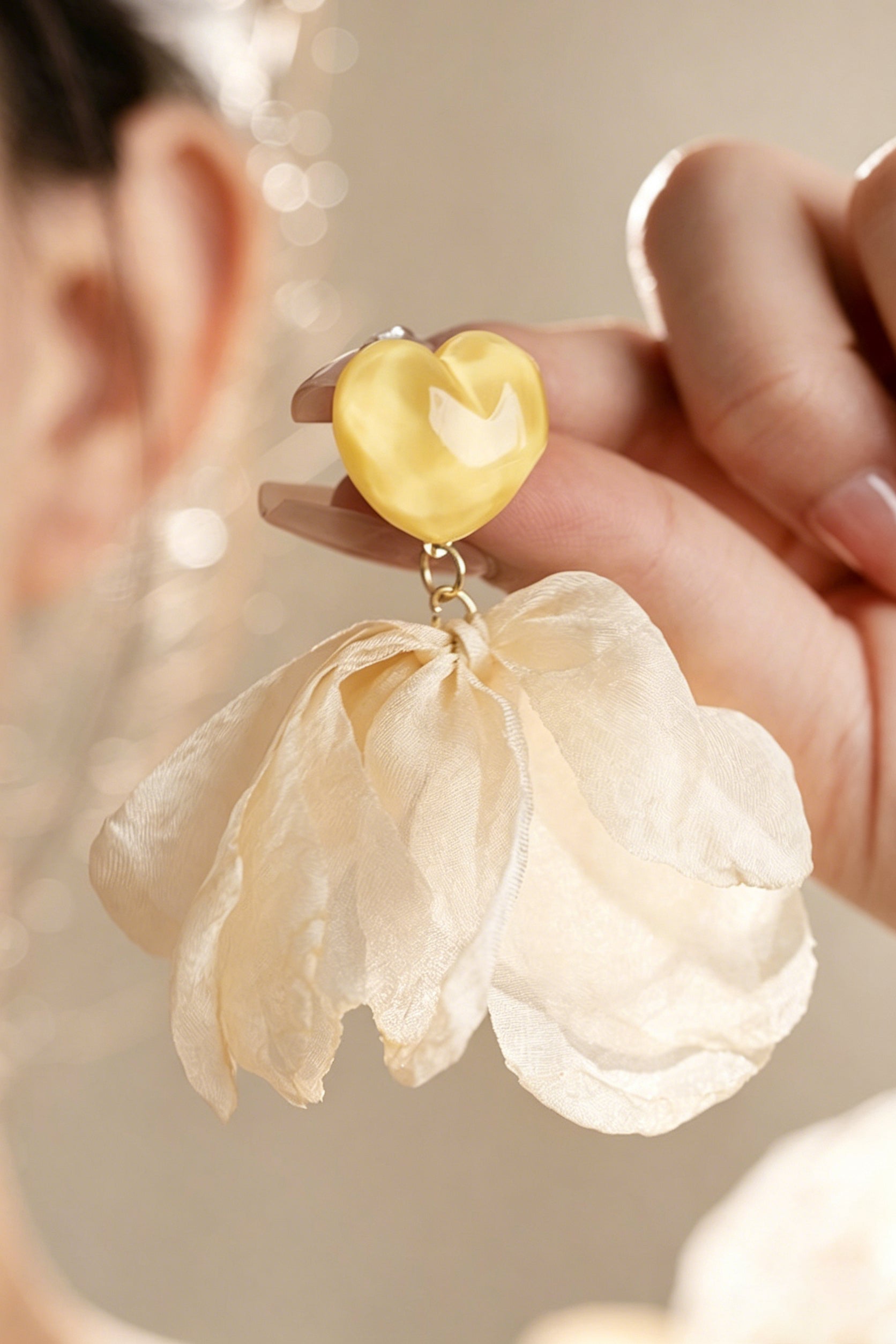 Earrings,heart shape shows bright details,fabric flowers show gentle fluffy feeling,combination of sweet and soft elements,strong layered styling,suitable for daily casual and romantic atmosphere |