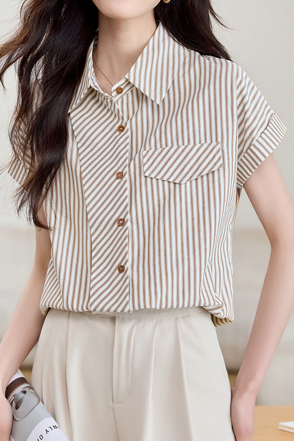 Shirt: Warm beige-brown striped fabric creates a gentle vintage vibe. Simple silhouette balances casual ease and professionalism, with lightweight fabric suited for summer—an easy, comfortable daily workwear style. |