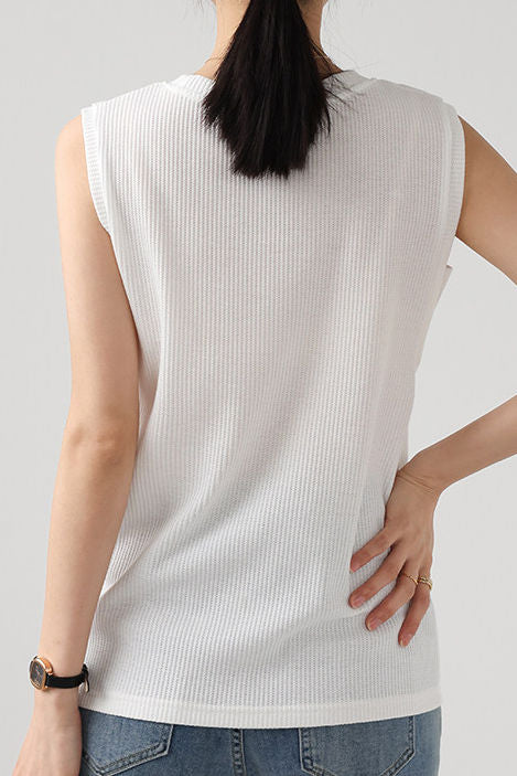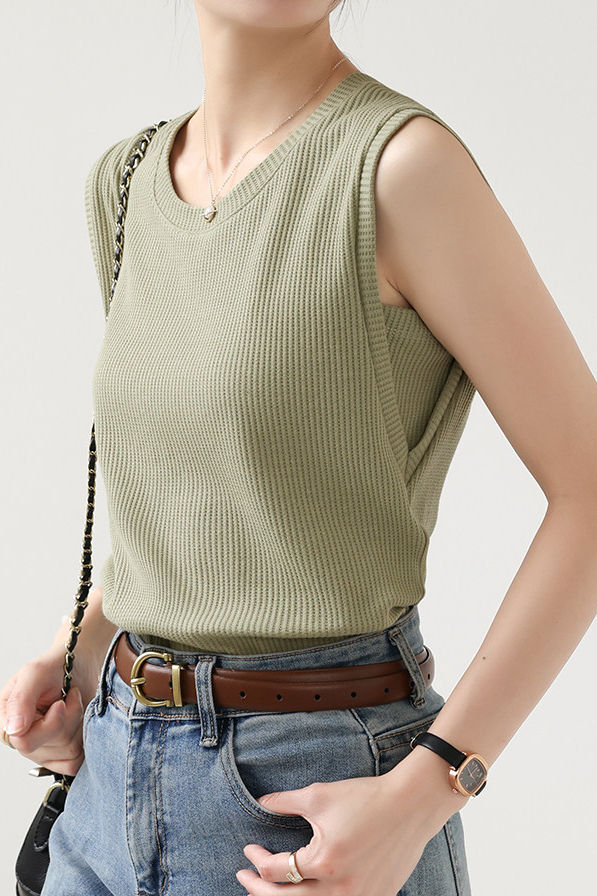 Vest, crew neck sleeveless slim fit, all-over waffle texture, wide wrapped shoulder, fake two-piece design at armhole. |