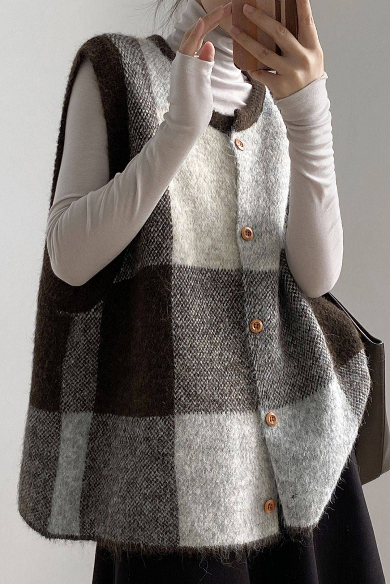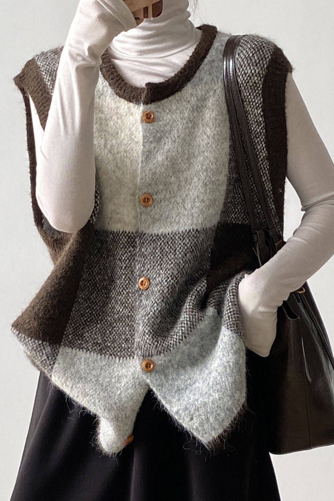 Casual Retro Plaid Crew Neck Sleeveless Knitted Vest Cardigan
