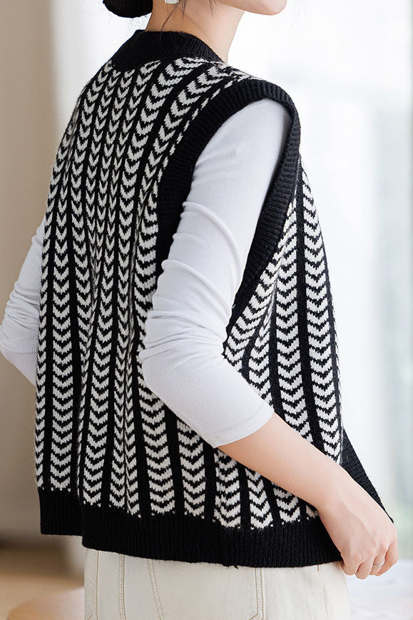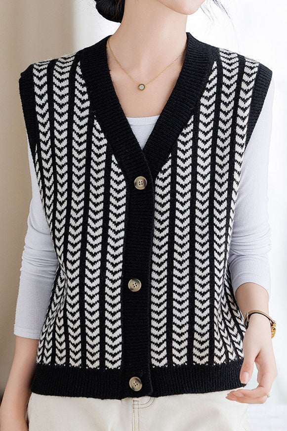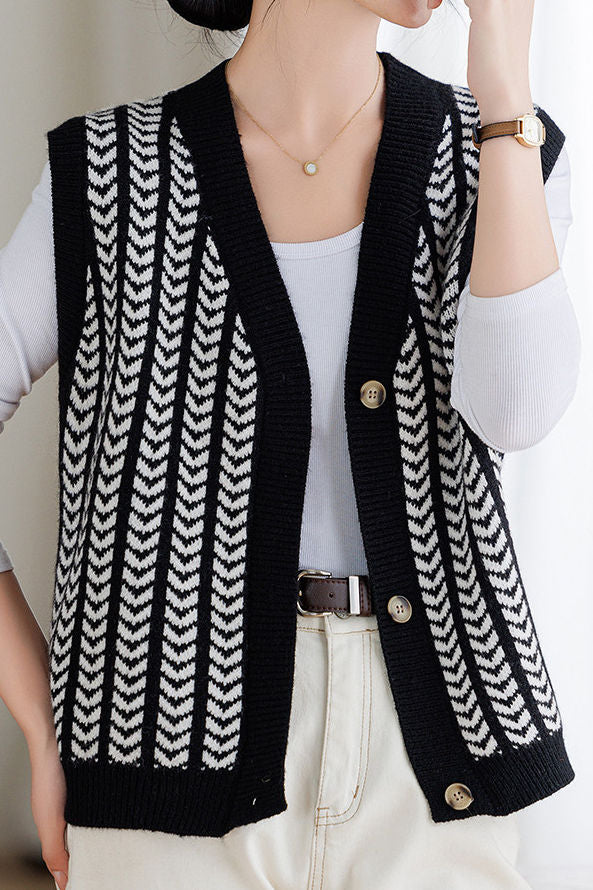 Knitted Vest, V-neck single-breasted button closure design, three-dimensional herringbone jacquard texture, soft stretchy knitted fabric, loose fit that suits all body types