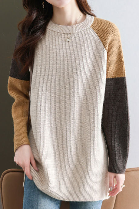 Casual Versatile Crew Neck Color-Block Long-Sleeve Sweater