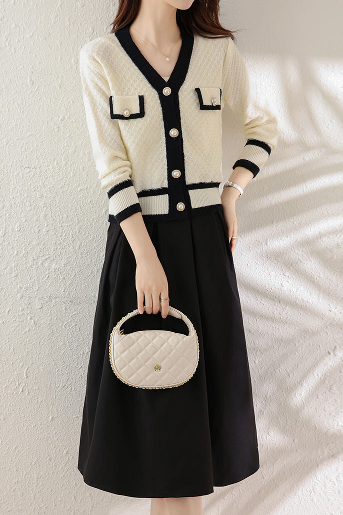 Elegant V-Neck Color-Block Cardigan A-Line Skirt 2-Piece Set