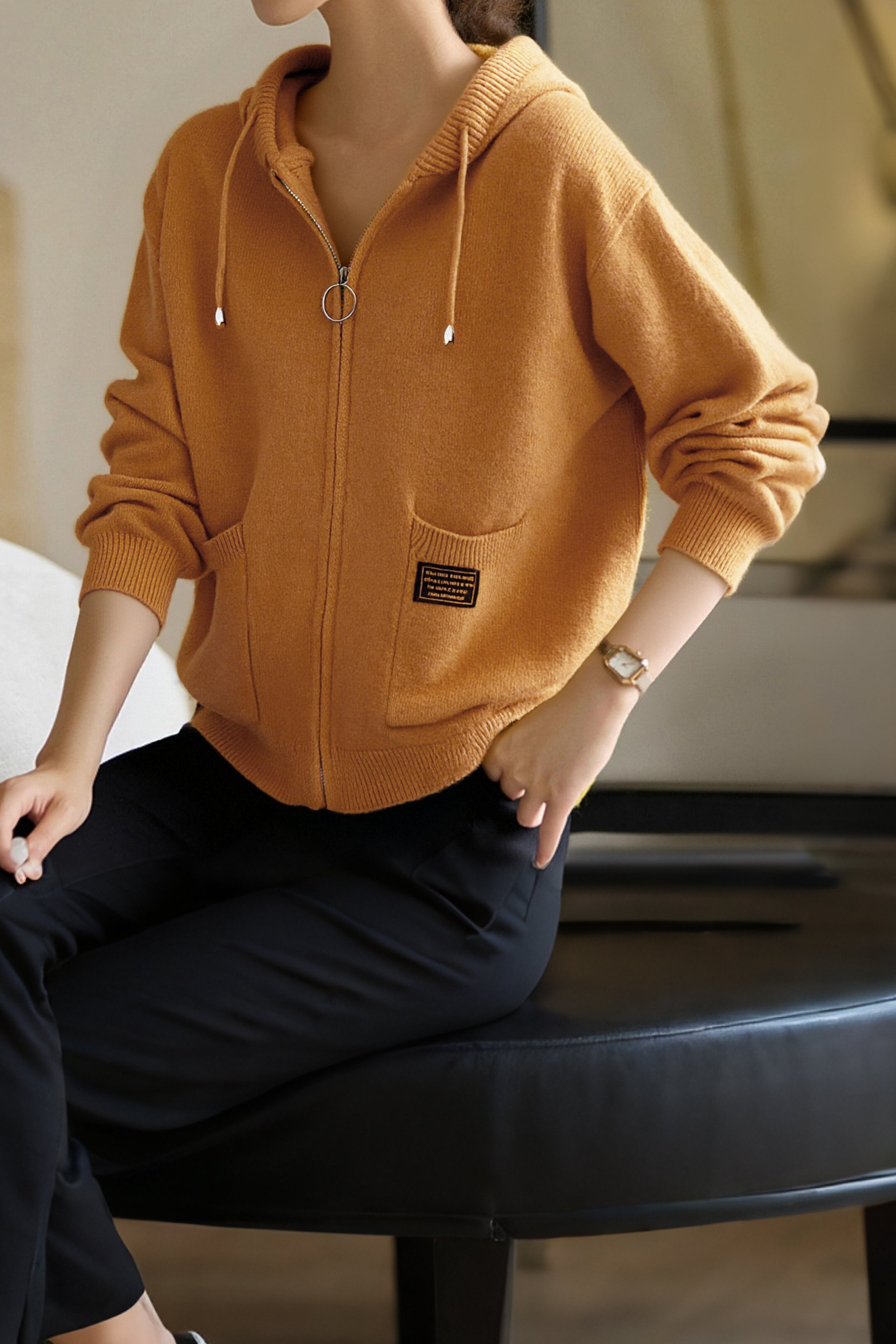 Casual Versatile Color-Block Hooded Zipper Knitted Cardigan