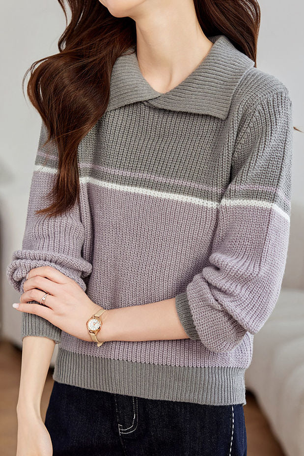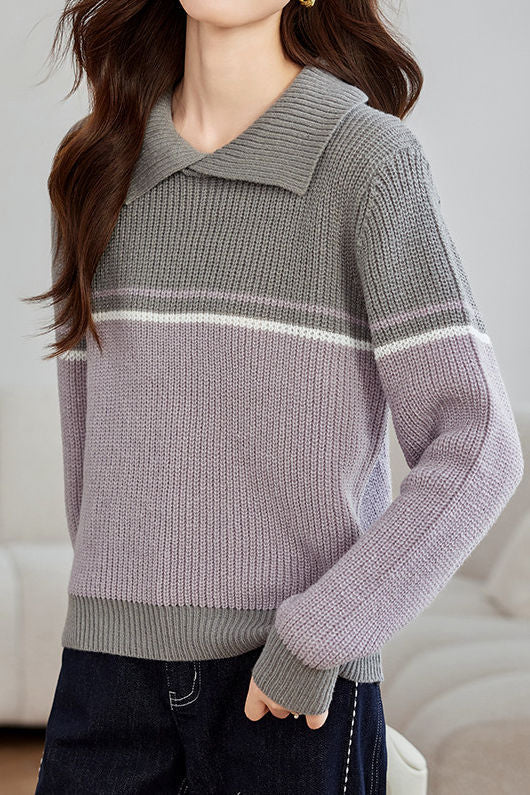 Casual Versatile Color-Block Lapel Pullover Knitted Top