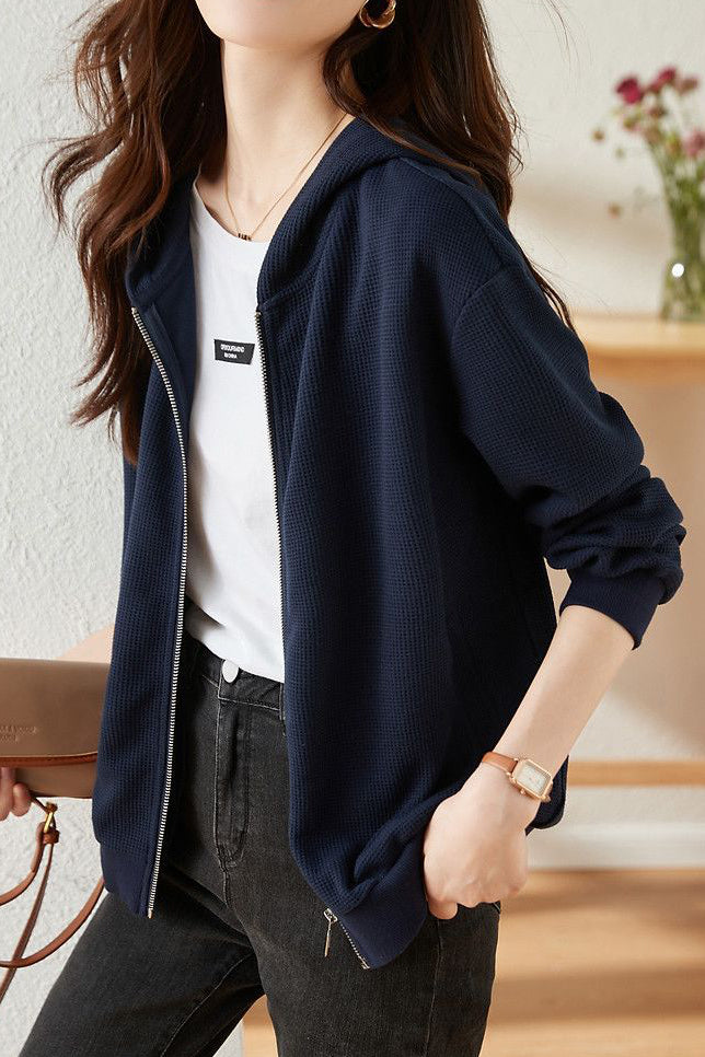 Versatile Casual Waffle Knit Hooded Zip-Up Jacket
