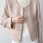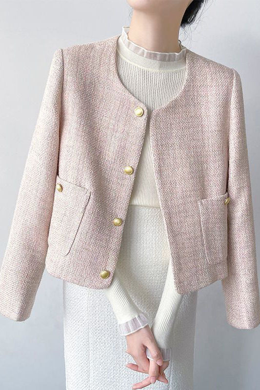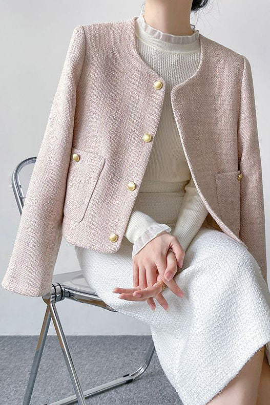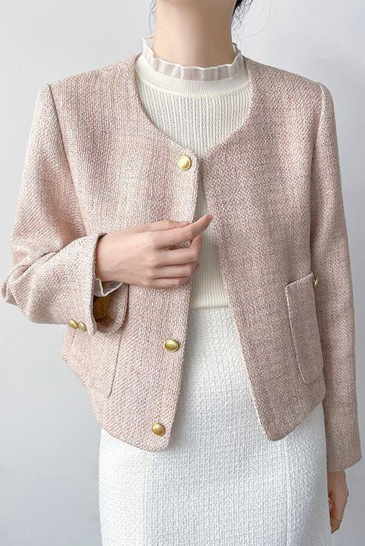 Tweed jacket, crew neck long-sleeve loose cropped fit, side patch pockets at waist, front placket with openable buttons, the matching of gold buttons and garment color shows elegant temperament |
