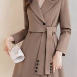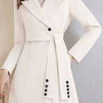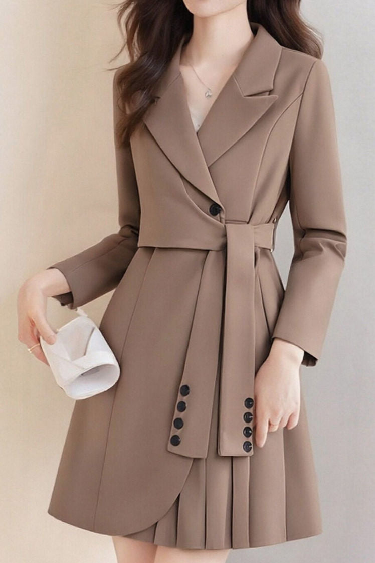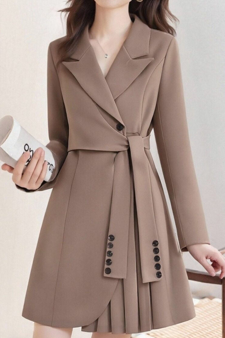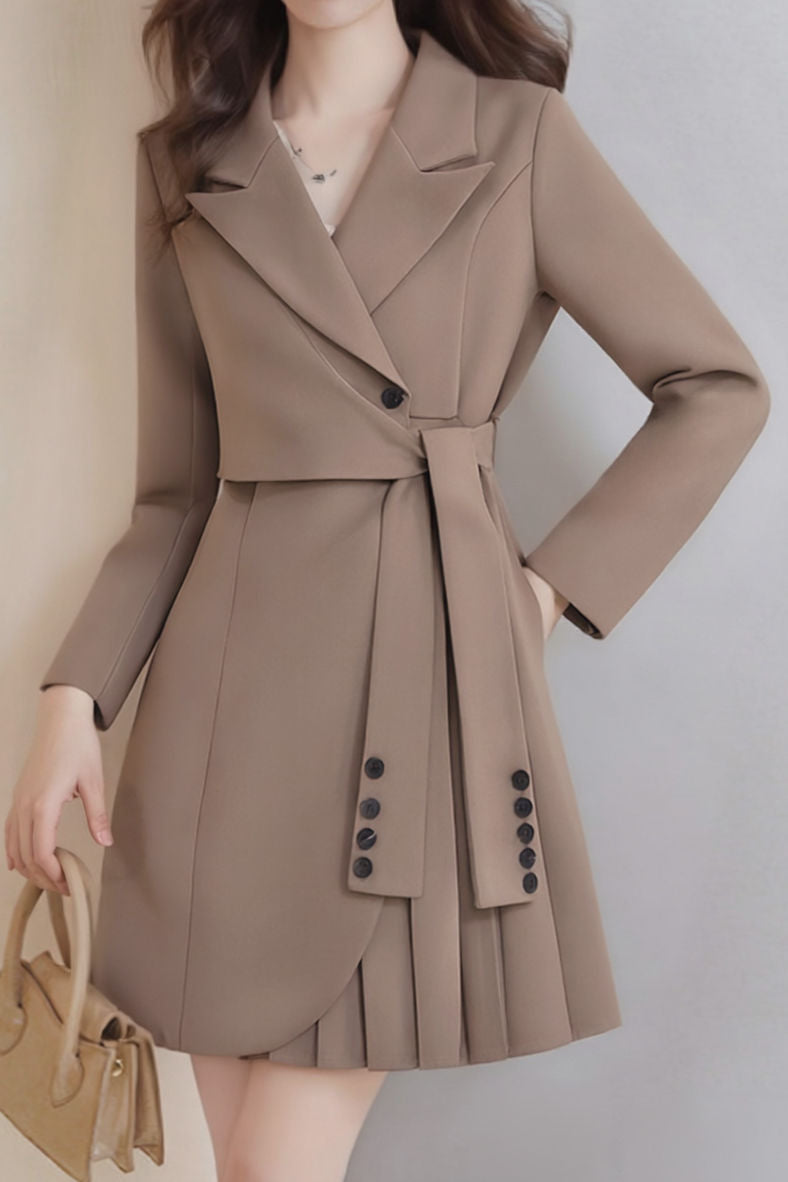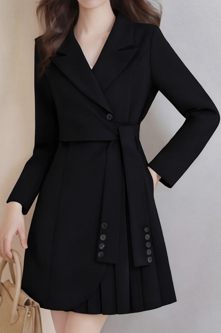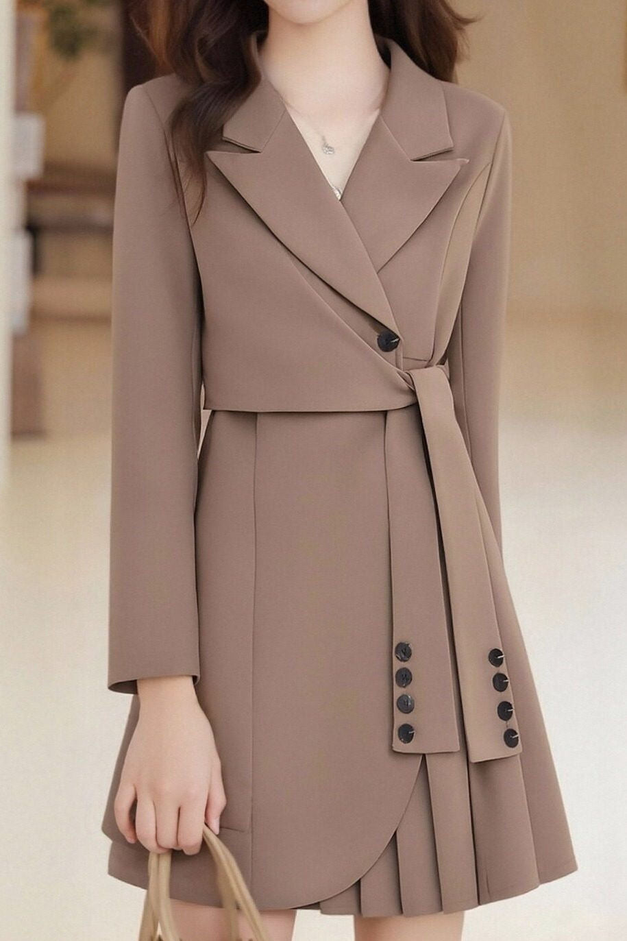 Dress, front with openable placket, notched lapel design, waist with tie belt decorated with ornamental buttons, asymmetric hem composed of skirt hem and blazer hem |