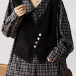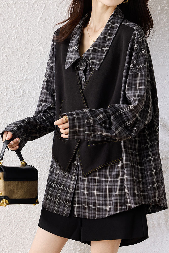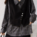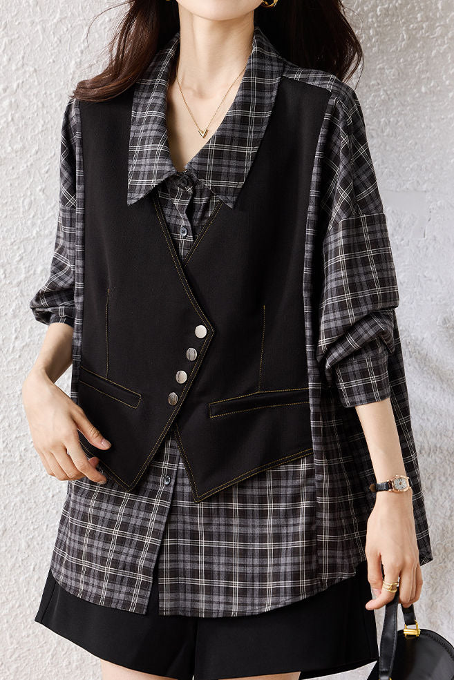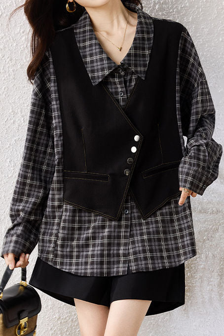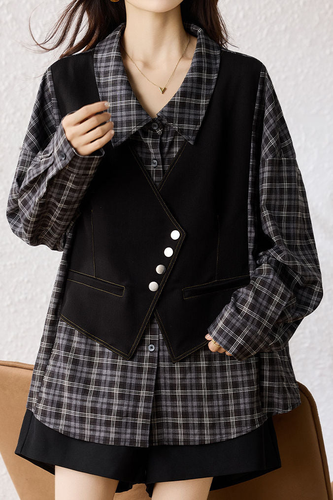 Shirt, lapel long-sleeve loose fit, fake two-piece design spliced with shirt and vest, vest part decorated with metal buttons and contrast stitching binding, full-body style combining plaid texture (shirt part) and solid-color minimalism (vest part) |