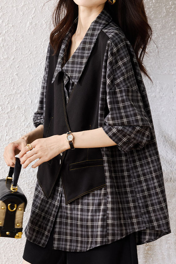 Casual Daily Fake Two-Piece Vest Plaid Shirt