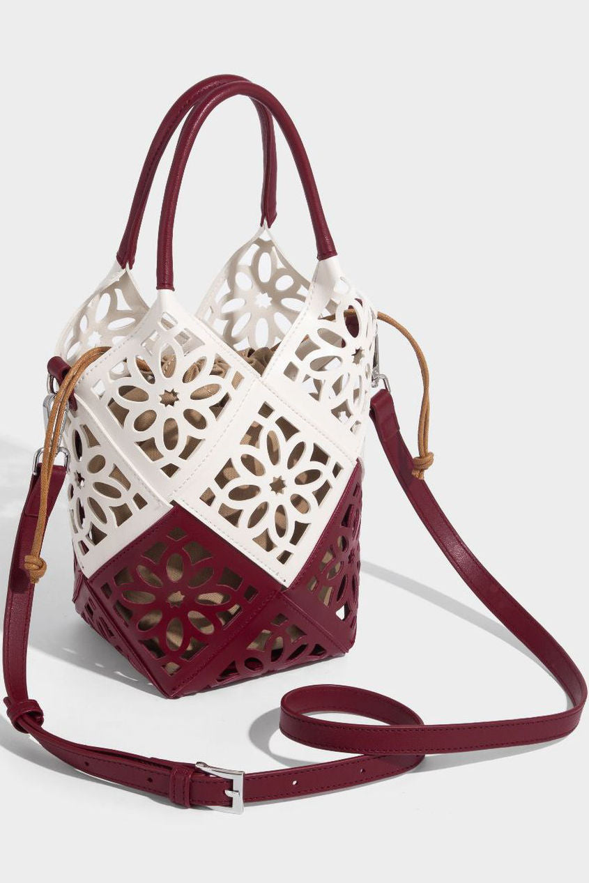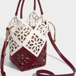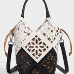 Bucket bag, bucket-shaped handbag and crossbody style, color-block patchwork design, full-body with floral hollow-out texture, equipped with drawstring closure, built-in same-shaped inner bag, paired with double top handles and detachable long shoulder strap |