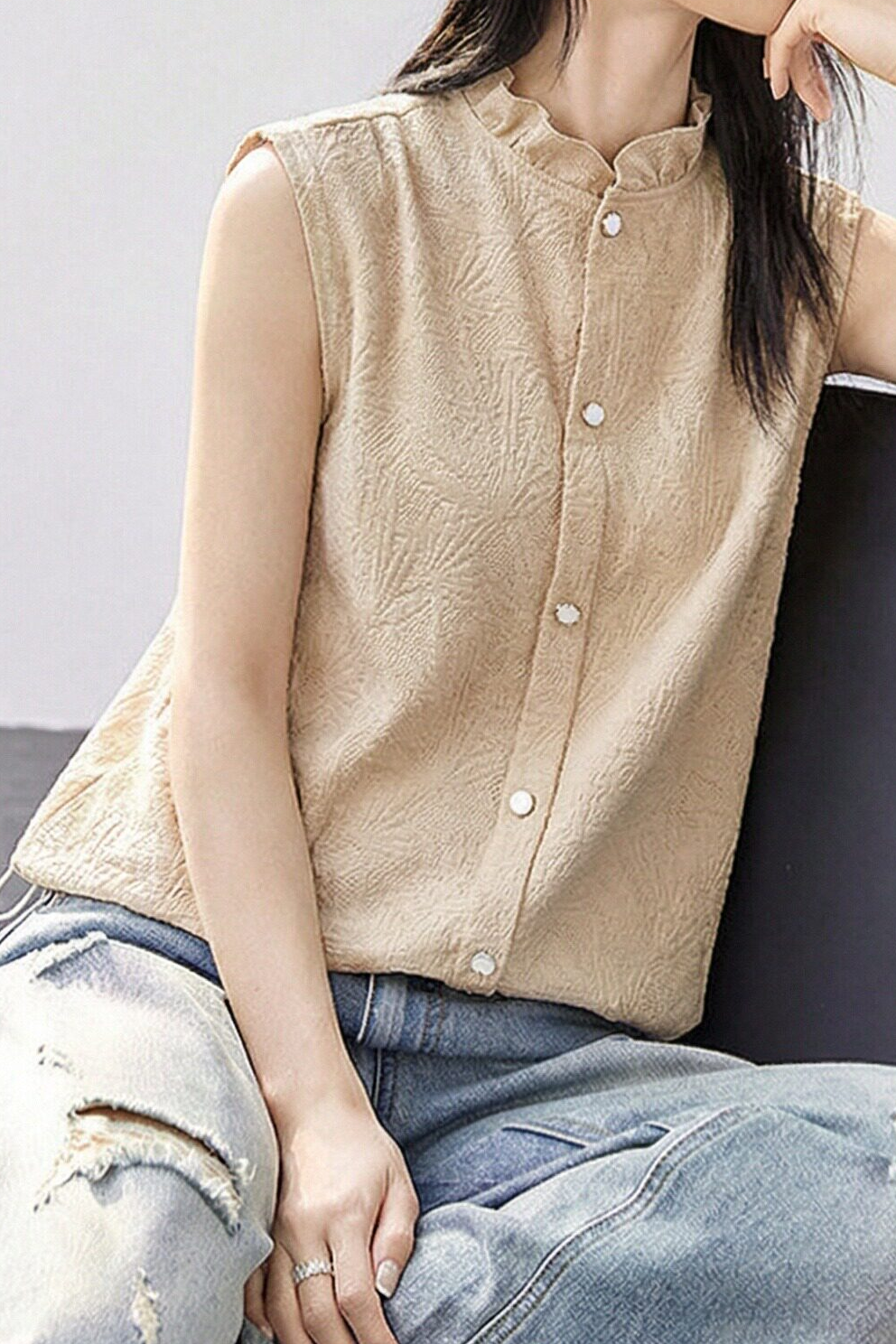 Vest, ruffle stand collar for feminine touch, breathable and skin-friendly textured fabric, sleeveless neat cut, single-button placket, gentle and practical. |