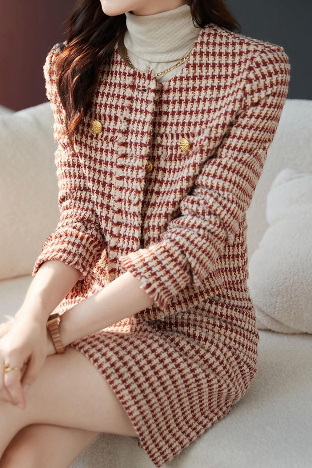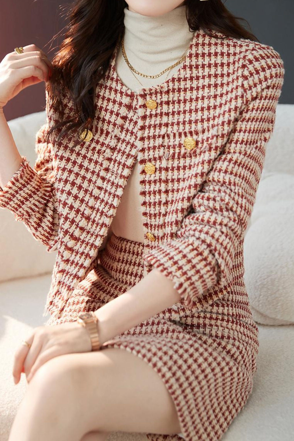 Exquisite Yarn-Dyed Houndstooth Short Coat And Skirt 2-Piece Set