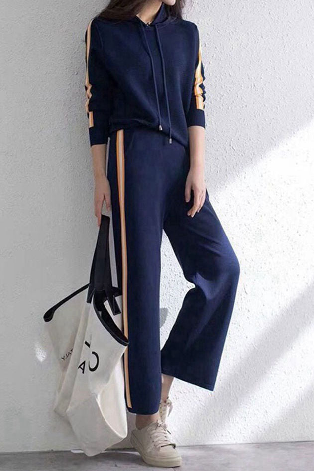 Casual Minimalist Hooded Long-Sleeve Top Knitted Set