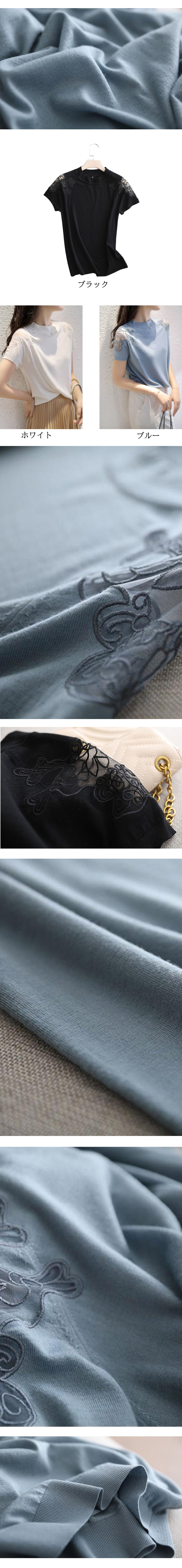 Bottle neck, short sleeves, solid color, shoulder side embroidery tulle switch design, basic, comfortable, knit material |