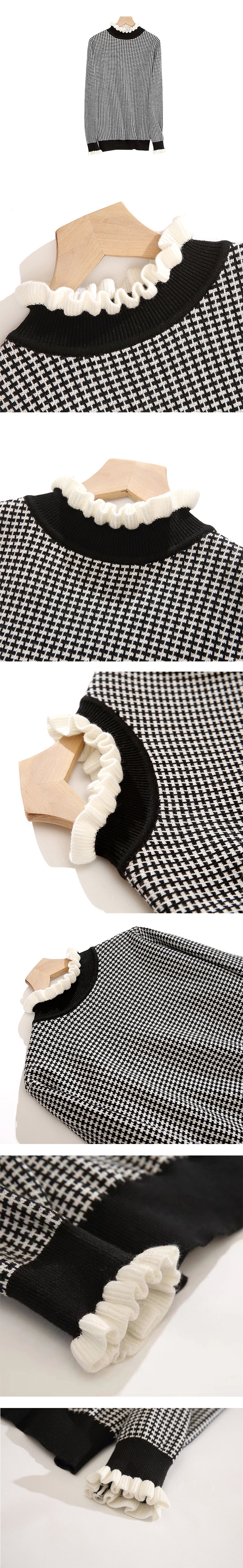 ニット素材、チェック柄、フリルスタンドカラー、フリルカフス、リブヘム、長袖、総柄、プルオーバー |